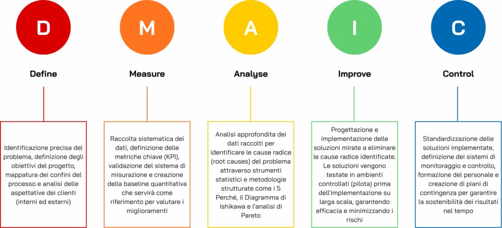 Il cuore operativo della Lean Six Sigma è rappresentato dal ciclo DMAIC, un framework strutturato che guida i team di miglioramento attraverso cinque fasi sequenziali e interdipendenti: